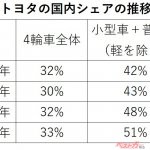日本国内の新車販売では、トヨタの独走状態が続いている。ホンダや日産が軽自動車に力を入れ、小型/普通車の販売力が減少傾向。その結果、小型/普通車に限るとトヨタの国内シェアは約50%に達した。