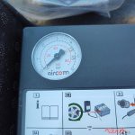 空気の入れ加減は、コンプレッサーに付いているメーターで確認する。タイヤの適正空気圧は運転席のドア付近にシールで貼られている場合が多いが、ここでは最高値ではなく最低値で十分。空気圧が高いと空気が洩れやすくなるので180~200MPa程度にとどめよう。