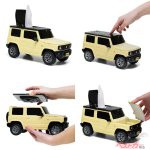 まずはその外観をじっくりと見てほしい。愛らしさとタフさが同居するJB64型ジムニーを完全再現しとるじゃないか。全長は285mm、幅が145mmというから、実車の12分の1スケールといったところ。スズキから公認ライセンスまで取得したというからただモノじゃない。マニアならこれ見てるだけでご飯3杯はいけますよ。