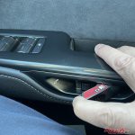 そこでレクサスRXのカギを受け取り、筆者がドアの内張を確認してみると、少し小さいかなと思いつつも、見ればドアハンドルをわかる形状。最近の電子スイッチ系は、押したり、撫でたり、横にスライドさせるものが多いため、ドアハンドルを普通に押して(タッチ)みると、パカンと開きました!