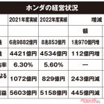 ホンダの収益は、2022年11月に発表され決算発表を見ると、2022年度は売上収益8兆853億円、営業利益4534億円で2021年度に対し売上収益は1兆970億円増、率にして15.7%のプラス。営業利益も112億円の増益で2.5%の伸びを見せている。