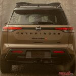 ボディサイドでは、3mはあるであろうロングホイールベースが特徴的。スリッド模様の入った推定20インチはある大径ホイール&タイヤや、前後に付いたブラックのフェンダーアーチも迫力満点だ。Cピラー周りの処理はリアのデザインなどは現行パスファインダーとは異なり、アリアやオーラ、エクストレイルといった最新の日産デザインを踏襲しているようだ。