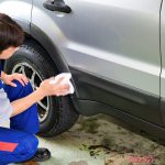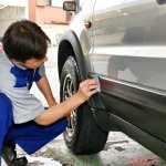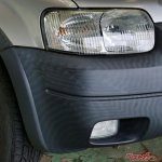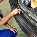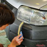 続いて、いよいよ樹脂パーツへのフェンダーキーパー塗布作業に移る。といっても何も特別な作業ではなく、専用の作業スポンジに樹脂フェンダーコーティング剤を染み込ませ、ワックスを塗るかのように無塗装の樹脂パーツ部分に塗り込んでいく。