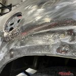「フェンダーの凹みを修理したんだと思うんです。もしかしたら予算の都合かもしれないけど、鉄板をたたき出さずに凹みの上から3cmくらいのパテを盛って造形してあった。僕らから見たら粗悪な修理だし、美しくない。本当ならしっかりした修復をしたかったんじゃないかな。僕らが完璧に仕上げます」。