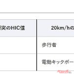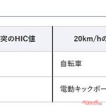 時速6kmで衝突した際の歩行者のHICは4351.8。これが時速20kmになると6957.8まで跳ね上がる。電動キックボードは乗っていない人にとっても被害を与えることが明らかなわけで、特に回避行動が緩慢になりやすい高齢の歩行者などには、十分な注意が必要となるだろう。
