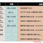 ただ、これら異物を抜いてしまうと、補修液が漏れ出てしまい、応急修理ができなかったケースもありました。通常、パンク修理キットの取り扱い説明書には、4mm以上の傷は応急修理できないとされていますが、今回のテストでは、4mm以上の傷であっても応急修理することができました。また、大きな金属片によって、トレッド面が大きく破けた傷の場合も、充填中に補修液が漏れだしてしまい、修理不可能でした。