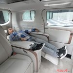 電動リクライニングはこの53度のポジションで一旦止まる。再度スイッチ操作をすると座面が前方にスライドしながら背もたれが倒れる。この動作を3段階繰り返し、最終的に背もたれは77度まで倒れる。体感的にはほぼフルフラットだ。ここまで倒すとオットマンは前席と干渉するため、助手席を前に出す必要がある。後席をここまで倒した状態で走行することは現実的ではないだろう。