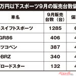 アンダー400万円スポーツの9月の販売を見るとけっこう厳しいが、スイスポだけは常に安定して1000台以上を販売。それによってこのクラスの平均値を510台まで引き上げているため、そのほかのモデルはすべて偏差値50を下回っている。