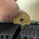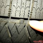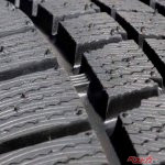 次にスリップサイン。むろん、夏タイヤ、スタッドレスタイヤにも存在するが、スリップサイン(1.6mm)が露出しているタイヤは当然、車検には通らない。