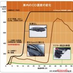 いっぽう定期的にマフラー周辺を除雪した場合は車内のCO濃度は低いまま。また窓を5cm程度開けただけでも、COの濃度が抑えられることが明らかになっている。