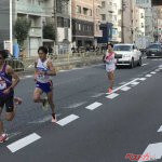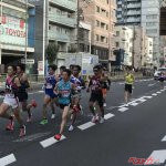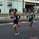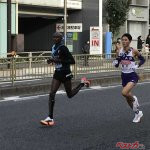 おおお~! 昂る気持ちでカメラを構えていたら、先代クラウンのパトカーが目の前を通過。「今回は大会車両として現行クラウンスポーツがくるのかッ!」と思った次の瞬間、1区のトップ争い2選手が目の前を通過! 24km/hほどの速さか。速ッ!