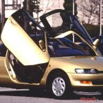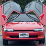 1990年~1996年に販売されていた、FFの小型3ドアクーペ、トヨタ「セラ」。トップルーフのほとんどがガラスエリアとなる特徴的なキャビン、そしてバタフライドアとよばれる斜めに跳ね上がるドアが特徴的なモデルであり、雨の日でもオープンカーと同じように明るく開放的な空間を楽しめる新感覚モデルとして、当時脚光を浴びていた。