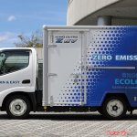こちらはコンベンショナルなトラックシャシーのGVW3.5t未満車で、パッと見は普通のエルフそのものだが、専用開発のシャシーに1.9L直噴ディーゼルRZ4E型エンジンと6速ATを搭載して、軽量化が図られている。