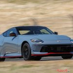 フェアレディZ NISMOは明確に操安性能を高める方向でチューニング。ノーマルZに対し、車体も足も剛性を高めている。操舵に対する反応がシャープになっているが、リアの粘りが強く、全体的にスタビリティが高く、よりハイスピードでのコーナリングでの安心感が高まっている。