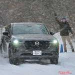 「CX-60は3.3Lディーゼルターボのトルクが大きく、エンジン回転を上げなくてもしっかり加速する。FRベースなので後輪が押し出す感覚で、滑りそうになると前輪が引っ張ってくれるのでテールが暴れるようなことはありません。