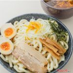 『つけ麺』で人気の「魚介系煮干しタレ」を使った、オリジナル「つけ汁うどん」。トッピングは『チャーシューと煮卵』。隠し味に「毛呂山産のゆずの皮」を使用