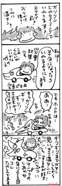 筆者はお出かけ前に必ず満タン派です! 愛車には平均燃料計や電子燃費計なんてハイテク装備はもちろん無いので、給油するごとに距離計をリセットして自分で計算しています。