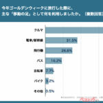 また、Q11で「はい」と回答した人に、「Q13.今年のゴールデンウィークに旅行した際に、主な『移動の足』として何を利用しましたか」(複数回答)と質問したところ、「クルマ」が68.9%とトップとなり、続いて「電車/新幹線」が31.5%、「飛行機」が26.6%だった。