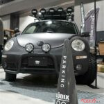ルーフキャリアもすでに社外品が存在しなかったため、難しいマウント方法などを検証しながら試行錯誤の上に専用設計したという。丸みあるボディとのバランスも良好で、一体感のあるデザインに仕上がっている。リアにあるバー状のキャリアもワイルドだ。