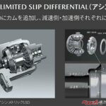 近年のLSDはトラクション(駆動力)確保と同時に曲がりやすさも両立した製品が増えているが、アシンメトリックLSDはブレーキング時にリアが不安定になる状況に着目し、ハンドルを切ってもLSDが効いて車体が安定するような仕組みを取り入れている。