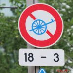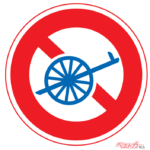 自転車がらみの標識でもうひとつレアなのが、斜線が引かれた赤丸のなかに今では滅多に見かけることがない大八車のイラストが描かれた標識。