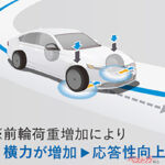 これまで採用されていたのは「アジャイルハンドリングアシスト」というメカニズムで、ステアリングを切り始めたときにクルマの動きを予想し、それに合わせてフロントのブレーキを左右独立に制御して、クルマの応答性を高めていた。