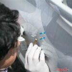 ドアパンチ被害の調査だが、極めて正統的かつ科学的なもの。被害車両を詳細に分析し、キズの形状や深さ、影響範囲などから、事故の原因や責任の所在を明らかにするという。