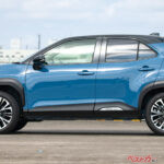 とかなんとか言いながら、全体を見ていて発見したのがリアドア下に貼ってあるヤリスクロスのロゴプレート。最初は「なぜこんなところに?」と訝しく思ったものだが、妄想を膨らませているうちに、これは絶対に必要なものであるという結論に至った。