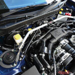STI自慢のフレキシブルタイプのフロントストラットタワーバーが鎮座するエンジンルーム内。tSの流儀に則り、エンジンチューンはいっさいなし