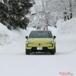 まず乗り心地が驚くほどいい。タウンスピードから高速まで、路面のギャップを実に優雅にいなしてくれる。EVならではの「無音感」もストレス低減に役立っているのだろう。ちなみにこの日履いていたのはミシュランのスタッドレス「X-ICE SNOW」で、サイズは前後とも245/45R19だった。
