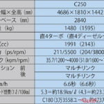 うち、C200はすでにAクラス系プラットフォームでも展開されている縦横両方のレイアウトが可能な最新世代の2L4気筒直噴ターボで、最高出力は184ps。C250はEクラスに搭載されている世界初の2L4気筒直噴リーンバーンターボで、最高出力は211psとなる。