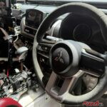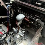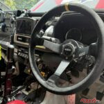 小出選手が駆るトライトンのステアリングは純正品。他の2台はモモ製となる。三菱の市販車に装着されるパドルシフトはほとんどがコラムに設置されるが社外品のためスポークの裏側に装着