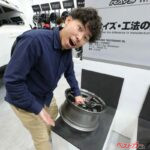 大阪オートメッセ2026のRAYSブースにて、鋳造品と鍛造品でどれほど重さが違うのか体感してみた。その差は明確であり、後者が圧倒的に軽い。同サイズ(16インチ・7J)にも関わらず、鍛造品は鋳造品に比べて4kgも軽かったのだ。