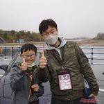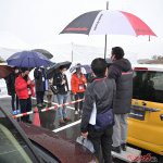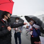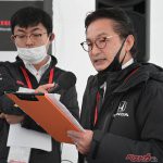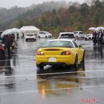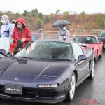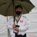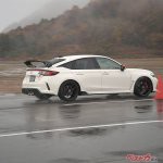 「こんなに完成されたシビックタイプRに実効空力だなんて俺も最初は『なに言ってんの?』と思ったよ。ところが雨の群サイ(群馬サイクルスポーツセンター)を走ったら3速4速のコーナーがぜんぜん違う。風の強い日もタイヤの接地が抜けてフワッとならない。今日は実効空力を試すには絶好の雨(笑)。路面のミューが低くてクルマの動きの違いも分かりやすいから、ぜひ皆さん自身で、それを体感してほしいな」