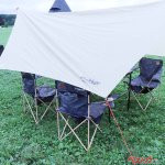 くつろいで食事をしたりするスペースとして、トレッカー ヘキサタープセット350×280UV (カーキ)16,500円を設置。こちらもポールを立ててロープで固定し、さらにタープの両側をガイドロープで固定するだけなので簡単だ。