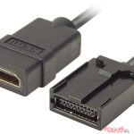 HDMI変換ケーブルAV003は、通常のHDMIコネクタ(タイプAメス)と純正ナビ用のHDMIコネクタ(タイプEオス)を備えた1.5mのケーブルだ。これによって一般的なHDMI機器の映像を純正ナビのHDMI入力から取り込み、車内で映像を表示することができる。
