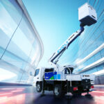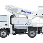 この電動高所作業車は、通信工事用のバケット作業高12m級高所作業車として生産・販売中の「スカイボーイAT-121TTE」を、通常のディーゼル車ではなく、小型BEVトラックに架装したもの。