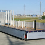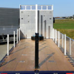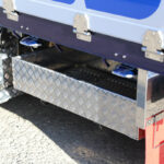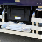 なお写真撮影時に荷台中央のスタンションガイドに差し込まれていたロングタイプのスタンションは、主要製品の一つである大型ガラス運搬用。最後部の黒いポールは平シートのテント掛け時にワイヤーを張るためのものだ。