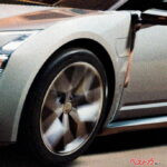ドアハンドルは流行りの格納式。“ショーモデルだから”かもしれないがホイールはセンターキャップに向かうにつれくぼむコンケイブ型というこだわりよう。