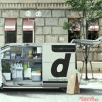 2023年に公開されたカヨイバコは、助手席ドアが開いて、後ろのドアがスライドするタントのようなセンターピラーレスだったが、今回発表されるモデルは写真を見る限り、助手席ドアの後ろに、観音開きドア+スライドドアのある形。全部開けると、商品陳列棚がピラーなしに見ることができる作りになっていると思われる。