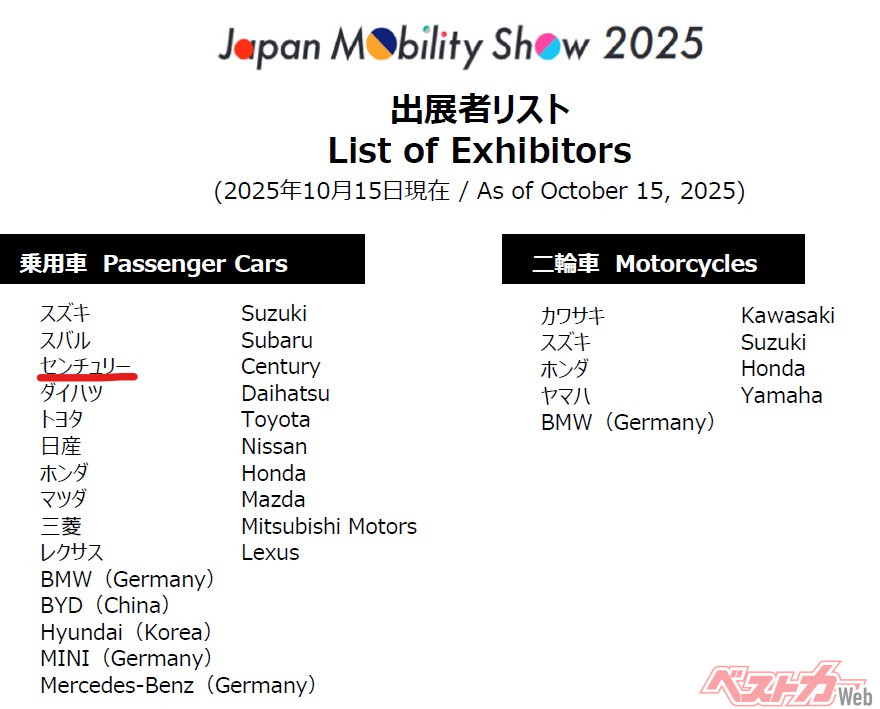 2025年10月30日~11月9日(東京ビッグサイト)に開催されるジャパンモビリティショーでは、トヨタ、レクサス、ダイハツと並んで「センチュリー」というブランドもブース出展されることが発表された(「GR」は今回のモビリティショーには出展せず、2026年1月開催の東京オートサロンでドバっといろいろ出すそうです)。