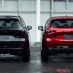 細かいところを見ていくと、その違いがわかる。新型の特徴的なLを2つ組み合わせたデイタイムランニングライトや左右の横長のテールランプとの間に新たに設けたMAZDAのロゴ、メッキ加飾のないモール類などが特徴。ロングノーズの全体的なプロポーションに大きな変化はないものの、御述するが後席の上のウインドウ処理が大きく異なる。