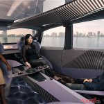 とはいえそれらを想定したインテリアは夢にあふれている。広大な床面は完全にフラットで、全面がLEDパネル。ここに雲を映し出せば、空の上を飛んでいるような気分になれるという。車体中央にはセンターコンソールが前後を貫いている。