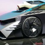 「フォージドカーボン(=軽量鍛造炭素繊維)」というものです。実はこのクルマは全体がフォージドカーボンでできています。ボディは塗装して模様が見えませんが、ホイールとかチンスポイラー、リアスポイラーとかは塗装していないのでそのように見えるというわけです」
