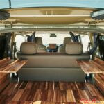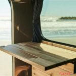 車中泊でのプライバシーを守るため、夏場の陽射しと冬場の冷気を遮断する遮光カーテンも装備する。使い勝手面では、車内空間を有効に活用するため、荷室部左右に天然木の収納式テーブルを採用した点も評価できる。