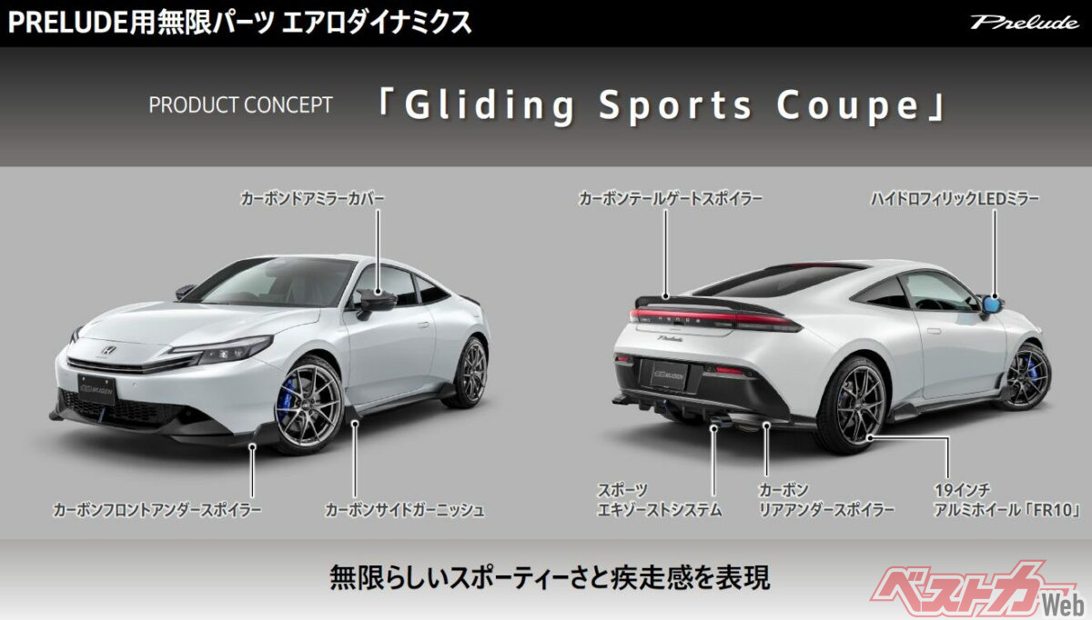 プレリュード用無限パーツは「Gliding Sports Coupe」をコンセプトに、スタイリングや走行性能といった車の本質にこだわるユーザーに向けて無限らしいスポーティさと疾走感を表現したパーツをラインナップ。