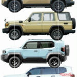 この点ランクルFJはかなり優れた素性を備えている。発表時の真横の画像にランクル70や250、300の写真を等倍で重ねてみるとアプローチアングルは他の3車とほぼ変わらず、デパーチャアングルはランクルFJが兄弟達を圧倒していた。