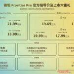 価格はフロンティアPROが16.99万〜19.99万元、PHEVが18.99万〜24.99万元(1元=約22円換算でおよそ373万7800円〜549万7800円)。