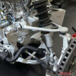 このエンジンでは、2基のターボチャージャーがVバンクの内側、Vの字の谷の部分に取り付けられている。そこから延びる排気管は直後でちょんまげのように曲がった触媒へと繋がり、ここで下方に曲げられて、床下へと伸びている。