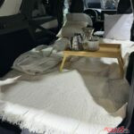 展示車をよく見ると後席のヘッドレストを逆さにつけており、こうすることで寝る時の枕にもなるのだ。もちろん移動中は正しい向きでの装着が必須であるが、こんな使い方を目で見える形で見せてくれたのは嬉しいポイント。